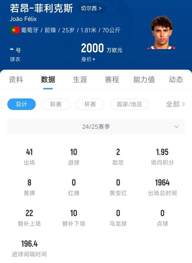2023年1月,菲利克斯租借加盟切尔西,开启了自己的流浪生涯。两年间菲利克斯先后辗转马竞、巴萨、切尔西、AC米兰4支球队,但在每支球队效力都没能超过半年。目前25岁的菲利克斯德转身价为2000万欧元,而在19岁时,菲利克斯的最高身价曾达到1亿欧元。