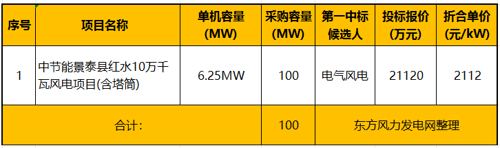 东方风力发电网讯:9月30日,中节能招标平台发布《中节能景泰县红水10万千瓦风电项目风力发电机组及塔筒设备采购》中标候选人公示,规模容量:100MW,单机容量要求:16台6.25MW。第一中标候选人为电气风电,投标报价21120万元。
