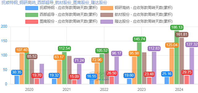 3)应收账款周转天数:抚顺特钢<图南股份<钢研高纳<隆达股份<航材股份<西部超导