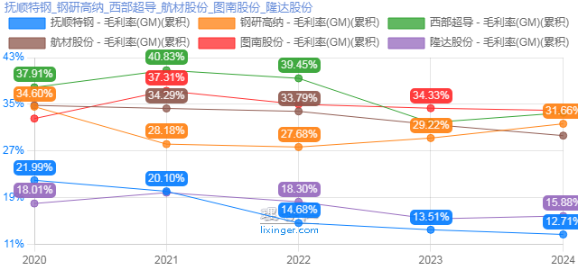 1)毛利率:图南股份>西部超导>钢研高纳>航材股份>隆达股份>抚顺特钢