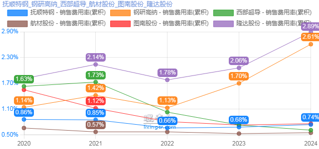 1)销售费用率:航材股份<西部超导<抚顺特钢<图南股份<钢研高纳<隆达股份