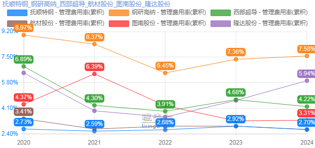 2)管理费用率:航材股份<图南股份<抚顺特钢<西部超导<隆达股份<钢研高纳
