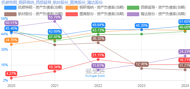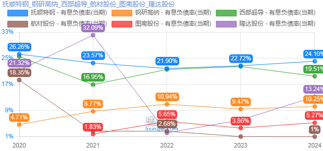 2)有息负债率:航材股份<图南股份<钢研高纳<隆达股份<西部超导<抚顺特钢