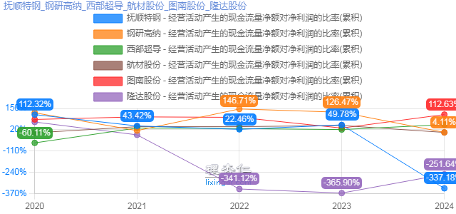 经营活动产生的现金流量净额与净利润比率:图南股份>西部超导>钢研高纳>航材股份>隆达股份>抚顺特钢