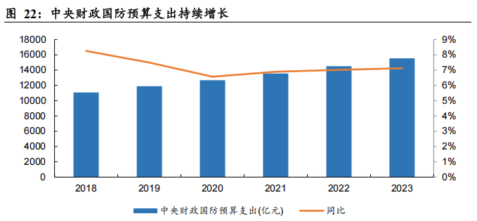 国际安全紧张局势下,军费投入持续增长。国防军费投入是军工产业发展的基础,我国2023年中央财政国防预算支出为1.55 亿元,同比增长7.1%,高于2023年国内生产总值5.0%的增长目标。当前国际政治与安全形势日趋复杂,中东地区地缘局势紧张,俄罗斯与乌克兰爆发武装冲突,美国与中国摩擦事件频发。在国际动荡局势下,中国为维护国家安全加强军队建设,军费投入水平有望实现持续较高增长。