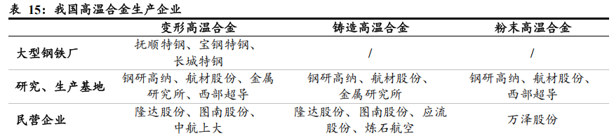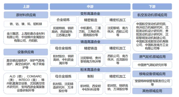 高温合金的主要下游企业包括航发集团下属的黎明、西航、黎阳、南方等军机航空发动机生产商,以及北京动力机械研究所(航天三院 31 所),航天科技集团六院(主要生产液体火箭发动机),中船重工703所(舰船燃气轮机)以及上海汽轮机、东方汽轮机、哈尔滨汽轮机等(工业燃气轮机)。