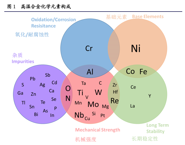 高温合金是指以铁、镍、钴为基体元素,能在600℃以上的高温环境下抗氧化或耐腐蚀,并能在一定应力作用下长期工作的一种金属材料。普通钢材含有十多种化学元素,而高温合金通常含有超过30-40种元素,高温合金之所以能在高温下保持较高的强度和硬度主要原因在于这些元素在组织中发挥着强化金属性能的作用。
