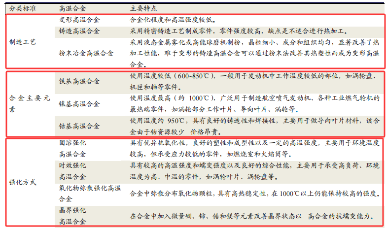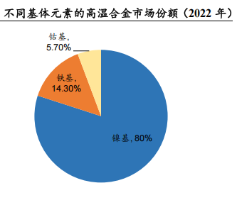 2)按基体元素,高温合金可以分为镍基高温合金(1000℃,市场占80%)、钴基高温合金(950℃,市场占14.3%)和铁基高温合金(600-850℃,市场占5.7%)等。