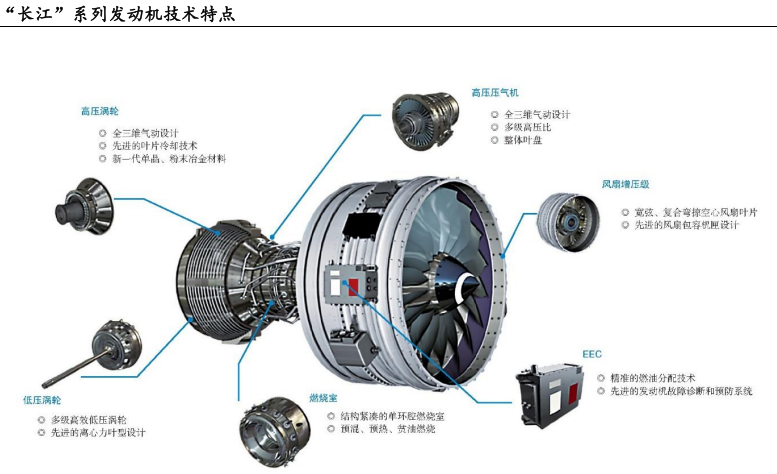 国产商用发动机正加速研制中。2017年CJ1000A核心机完成组装,2018年5月点火启动成功,核心转速达到设计要求,2020年开始进入地面台架测试阶段。“长江”系列三个产品在技术上一脉相承,以CJ1000发动机的核心机为基准,通过相似放大和局部优化发展出CJ2000的核心机, 再匹配低压部件并嵌入经过验证的新技术后形成CJ2000发动机,CJ500核心机则基于CJ1000核心机缩小改进而来。在此基础上,能够大大缩短研制周期。2020年7月,CJ-2000AX验证机完成整机装配。CJ500发动机正处于研制阶段。国产商用发动机正加速研制,研制成功后将装配于国产大飞机上,打开国内商用航发市场第二增长曲线。