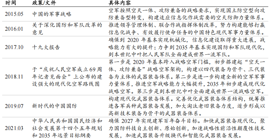 政策力度升级,推动军用航空市场保持高景气度。空军具备高速机动性、快速战略投送能力、强大精确打击能力等特性,其在国家安全战略中的地位持续上升,逐渐成为一国海陆空现代化防御体系的核心。国内航空领域持续出台利好政策文件,2015年中国国防白皮书《中国的军事战略》首次提出空军按照空天一体、攻防兼备的战略要求,实现“国土防空”向“攻防兼备”转变。