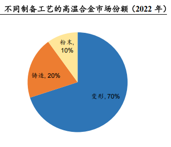 1)按制备工艺,高温合金可分为铸造高温合金(市场占20%)、变形高温合金(市场占70%)和粉末高温合金(市场占10%)。