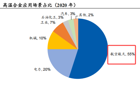 作为飞机动力装置的航空发动机是航空工业中技术含量最高、难度最大的部件之一,需要具备轻质、高强、高韧、耐高温、抗氧化、耐腐蚀等性能,而高温合金作为在 600℃以上及一定应力条件下长期工作的金属材料,满足现代航空发动机对材料的苛刻要求,已成为航空发动机热端部件不可替代的关键材料。在先进的航空发动机中,高温合金用量所占比例已高达50%以上。随着技术的发展和产量的提升,高温合金耐高温耐腐蚀的特点使其在柴油机和内燃机涡轮增压、燃气轮机、石油化工、汽车工业等民用工业中逐步广泛应用。从我国高温合金应用结构来看,航空航天领域是高温合金最大的应用领域,应用占比达55%;其次为电力及机械领域,占比分别为20%和10%。