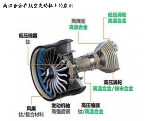 高温合金是航空发动机热端部件的关键材料。航空发动机是现代工业“皇冠上的明珠”,是高温合金最重要的应用领域。航空发动机的技术进步与高温合金的发展密切相关,高温合金是推动航空发动机发展最为关键的结构材料。随着对新型的先进航空发动机推重比的要求不断提高,对高性能高温合金材料的依赖越来越大。航空发动机材料进入冷端以钛为主、热端以镍为主的镍、钛、钢“三国鼎立”时代。在先进航空发动机中,高温合金用量占发动机总重量 40%-60%,主要用于四大热端部件:燃烧室、导向器、涡轮叶片和涡轮盘,此外,还用于机匣、环件、加力燃烧室和尾喷口等部件。